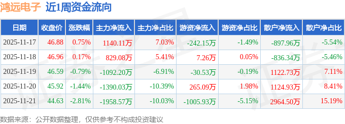 资金流向数据方面,本周鸿远电子主力资金合计净流出2471.61万元,游资资金合计净流出1006.25万元,散户资金合计净流入3477.86万元。本周资金流向一览见下表: