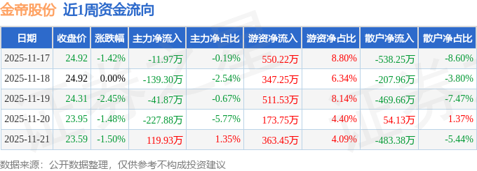 资金流向数据方面,本周金帝股份主力资金合计净流出301.09万元,游资资金合计净流入1946.2万元,散户资金合计净流出1645.11万元。本周资金流向一览见下表: