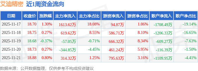 资金流向数据方面,本周艾迪精密主力资金合计净流入2145.66万元,游资资金合计净流入2604.77万元,散户资金合计净流出4750.43万元。本周资金流向一览见下表: