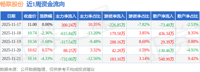 资金流向数据方面,本周畅联股份主力资金合计净流出1276.89万元,游资资金合计净流入466.12万元,散户资金合计净流入810.77万元。本周资金流向一览见下表: