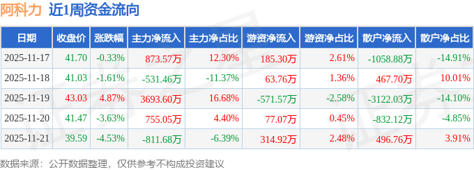 资金流向数据方面,本周阿科力主力资金合计净流入3979.09万元,游资资金合计净流入69.48万元,散户资金合计净流出4048.57万元。本周资金流向一览见下表: