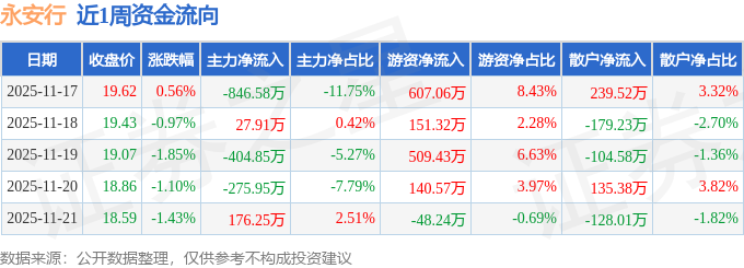 资金流向数据方面,本周永安行主力资金合计净流出1323.22万元,游资资金合计净流入1360.14万元,散户资金合计净流出36.91万元。本周资金流向一览见下表:
