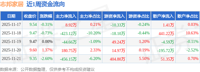 资金流向数据方面,本周志邦家居主力资金合计净流出734.25万元,游资资金合计净流入440.58万元,散户资金合计净流入293.68万元。本周资金流向一览见下表: