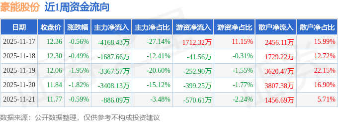 资金流向数据方面,本周豪能股份主力资金合计净流出1.35亿元,游资资金合计净流入448.0万元,散户资金合计净流入1.31亿元。本周资金流向一览见下表: