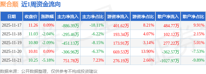 资金流向数据方面,本周聚合顺主力资金合计净流出1188.15万元,游资资金合计净流入1714.58万元,散户资金合计净流出526.43万元。本周资金流向一览见下表: