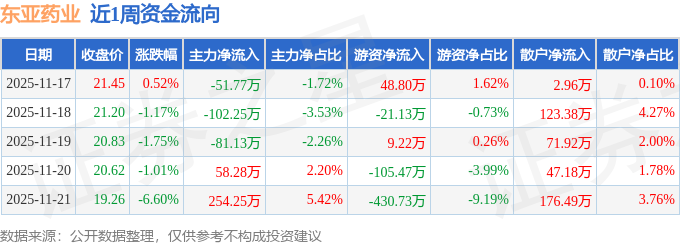 资金流向数据方面,本周东亚药业主力资金合计净流入77.38万元,游资资金合计净流出499.31万元,散户资金合计净流入421.93万元。本周资金流向一览见下表: