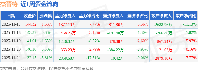 资金流向数据方面,本周杰普特主力资金合计净流出1416.14万元,游资资金合计净流入603.9万元,散户资金合计净流入812.24万元。本周资金流向一览见下表:
