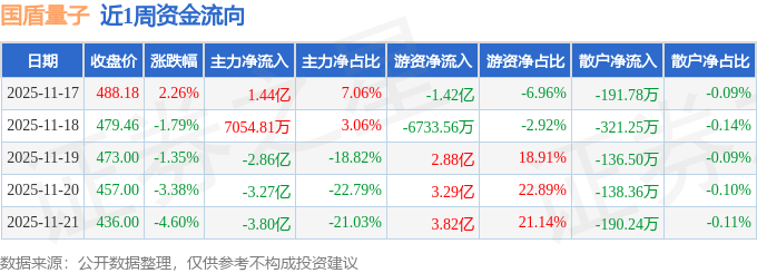 资金流向数据方面,本周国盾量子主力资金合计净流出7.79亿元,游资资金合计净流入7.89亿元,散户资金合计净流出978.12万元。本周资金流向一览见下表: