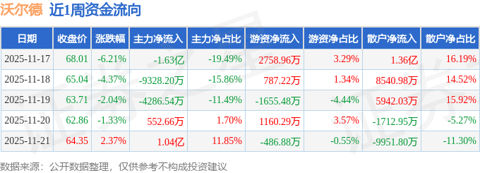 资金流向数据方面,本周沃尔德主力资金合计净流出1.89亿元,游资资金合计净流入2564.11万元,散户资金合计净流入1.64亿元。本周资金流向一览见下表: