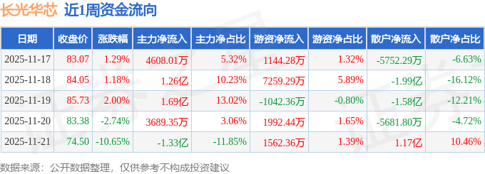 资金流向数据方面,本周长光华芯主力资金合计净流入2.45亿元,游资资金合计净流入1.09亿元,散户资金合计净流出3.54亿元。本周资金流向一览见下表:
