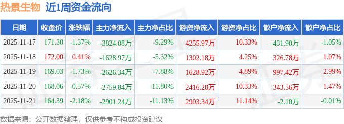 资金流向数据方面,本周热景生物主力资金合计净流出1.37亿元,游资资金合计净流入1.25亿元,散户资金合计净流入1233.77万元。本周资金流向一览见下表:
