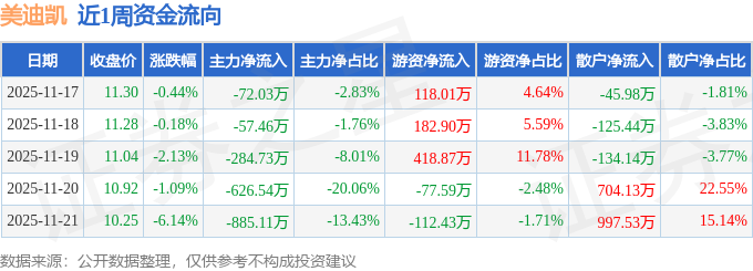 资金流向数据方面,本周美迪凯主力资金合计净流出1925.87万元,游资资金合计净流入529.77万元,散户资金合计净流入1396.1万元。本周资金流向一览见下表: