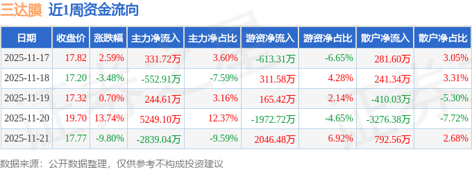 资金流向数据方面,本周三达膜主力资金合计净流入2433.47万元,游资资金合计净流出62.55万元,散户资金合计净流出2370.91万元。本周资金流向一览见下表: