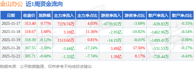 资金流向数据方面,本周金山办公主力资金合计净流出7699.39万元,游资资金合计净流入1.26亿元,散户资金合计净流出4862.17万元。本周资金流向一览见下表: