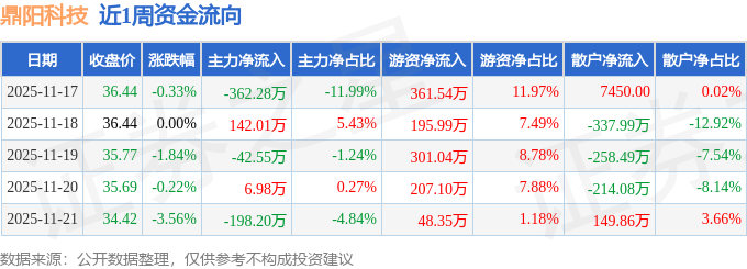 资金流向数据方面,本周鼎阳科技主力资金合计净流出454.04万元,游资资金合计净流入1114.01万元,散户资金合计净流出659.96万元。本周资金流向一览见下表: