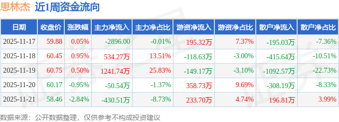 资金流向数据方面,本周思林杰主力资金合计净流入1294.68万元,游资资金合计净流入519.95万元,散户资金合计净流出1814.63万元。本周资金流向一览见下表: