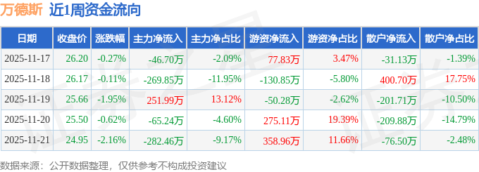 资金流向数据方面,本周万德斯主力资金合计净流出412.25万元,游资资金合计净流入530.77万元,散户资金合计净流出118.52万元。本周资金流向一览见下表: