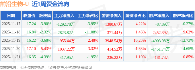 资金流向数据方面,本周前沿生物主力资金合计净流出2541.89万元,游资资金合计净流入6351.39万元,散户资金合计净流出3809.5万元。本周资金流向一览见下表: