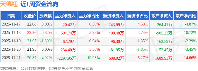 资金流向数据方面,本周天德钰主力资金合计净流出1471.09万元,游资资金合计净流入1266.83万元,散户资金合计净流入204.27万元。本周资金流向一览见下表:
