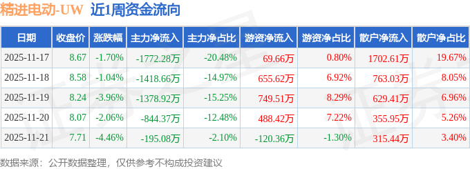 资金流向数据方面,本周精进电动主力资金合计净流出5609.3万元,游资资金合计净流入1842.85万元,散户资金合计净流入3766.45万元。本周资金流向一览见下表: