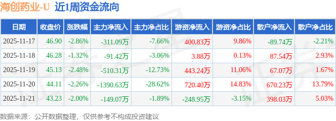 资金流向数据方面,本周海创药业主力资金合计净流出2452.53万元,游资资金合计净流入1319.4万元,散户资金合计净流入1133.13万元。本周资金流向一览见下表: