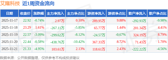 资金流向数据方面,本周艾隆科技主力资金合计净流出898.92万元,游资资金合计净流入817.09万元,散户资金合计净流入81.82万元。本周资金流向一览见下表: