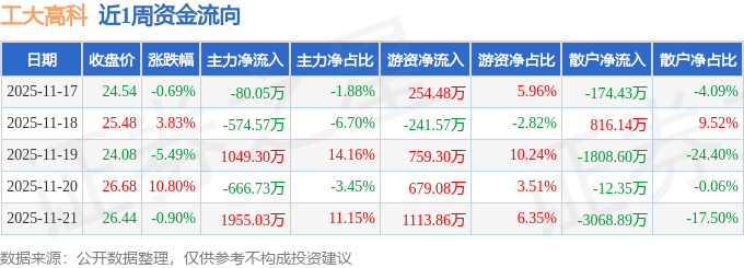 资金流向数据方面,本周工大高科主力资金合计净流入1682.99万元,游资资金合计净流入2565.14万元,散户资金合计净流出4248.13万元。本周资金流向一览见下表: