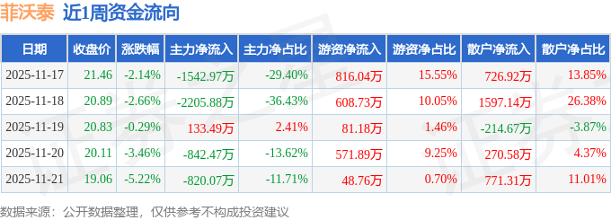 资金流向数据方面,本周菲沃泰主力资金合计净流出5277.9万元,游资资金合计净流入2126.6万元,散户资金合计净流入3151.3万元。本周资金流向一览见下表: