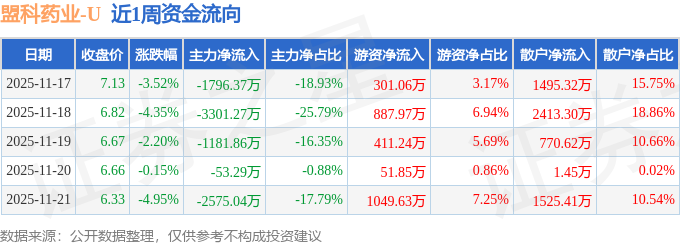 资金流向数据方面,本周盟科药业主力资金合计净流出8907.84万元,游资资金合计净流入2701.75万元,散户资金合计净流入6206.09万元。本周资金流向一览见下表: