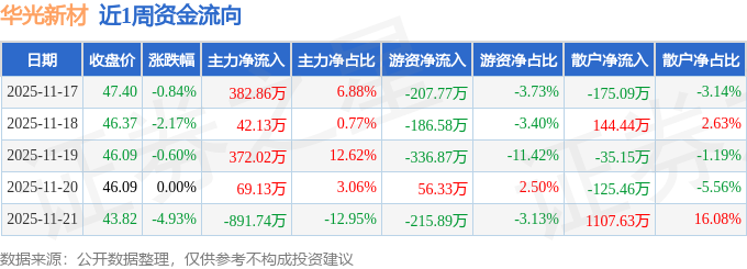资金流向数据方面,本周华光新材主力资金合计净流出25.59万元,游资资金合计净流出890.78万元,散户资金合计净流入916.37万元。本周资金流向一览见下表: