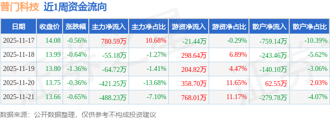 资金流向数据方面,本周普门科技主力资金合计净流出248.8万元,游资资金合计净流入1608.73万元,散户资金合计净流出1359.92万元。本周资金流向一览见下表: