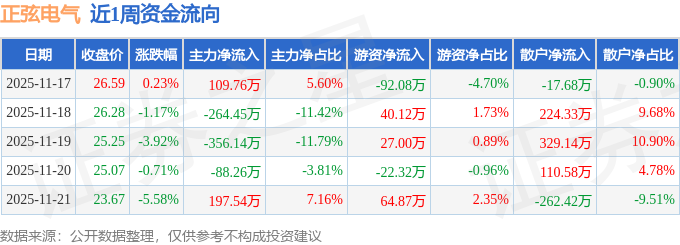 资金流向数据方面,本周正弦电气主力资金合计净流出401.55万元,游资资金合计净流入17.6万元,散户资金合计净流入383.95万元。本周资金流向一览见下表: