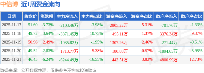 资金流向数据方面,本周中信博主力资金合计净流出1.15亿元,游资资金合计净流入6231.98万元,散户资金合计净流入5309.48万元。本周资金流向一览见下表: