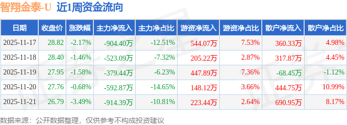 资金流向数据方面,本周智翔金泰主力资金合计净流出3314.19万元,游资资金合计净流入1568.75万元,散户资金合计净流入1745.45万元。本周资金流向一览见下表: