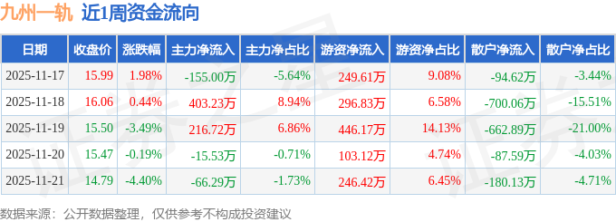 资金流向数据方面,本周九州一轨主力资金合计净流入383.13万元,游资资金合计净流入1342.16万元,散户资金合计净流出1725.29万元。本周资金流向一览见下表: