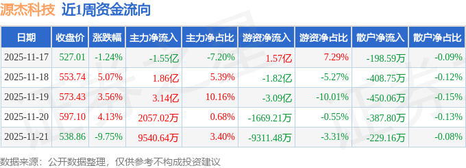 资金流向数据方面,本周源杰科技主力资金合计净流入4.62亿元,游资资金合计净流出4.45亿元,散户资金合计净流出1674.37万元。本周资金流向一览见下表: