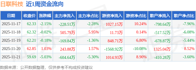资金流向数据方面,本周日联科技主力资金合计净流出253.32万元,游资资金合计净流入1333.59万元,散户资金合计净流出1080.27万元。本周资金流向一览见下表: