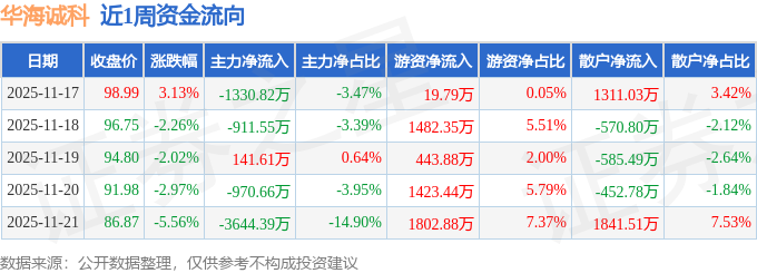 资金流向数据方面,本周华海诚科主力资金合计净流出6715.82万元,游资资金合计净流入5172.34万元,散户资金合计净流入1543.47万元。本周资金流向一览见下表: