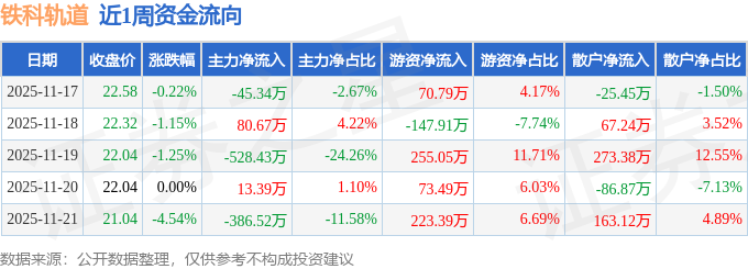 资金流向数据方面,本周铁科轨道主力资金合计净流出866.23万元,游资资金合计净流入474.81万元,散户资金合计净流入391.42万元。本周资金流向一览见下表: