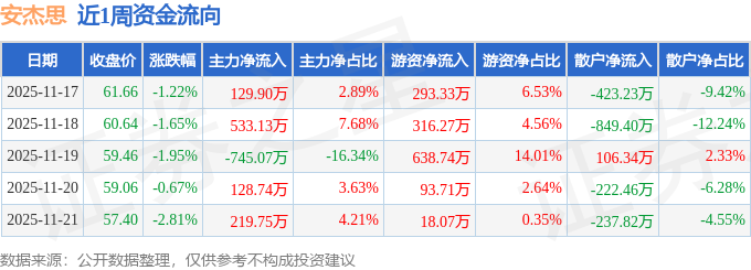 资金流向数据方面,本周安杰思主力资金合计净流入266.46万元,游资资金合计净流入1360.11万元,散户资金合计净流出1626.57万元。本周资金流向一览见下表: