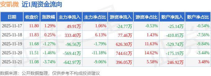 资金流向数据方面,本周安凯微主力资金合计净流出925.64万元,游资资金合计净流入1819.64万元,散户资金合计净流出894.0万元。本周资金流向一览见下表: