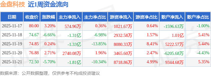 资金流向数据方面,本周金盘科技主力资金合计净流出4.11亿元,游资资金合计净流入2.42亿元,散户资金合计净流入1.69亿元。本周资金流向一览见下表: