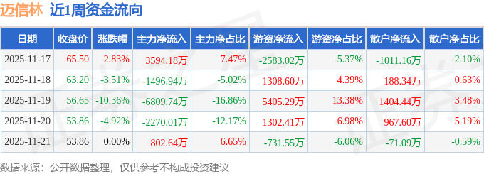 资金流向数据方面,本周迈信林主力资金合计净流出6179.87万元,游资资金合计净流入4701.74万元,散户资金合计净流入1478.13万元。本周资金流向一览见下表: