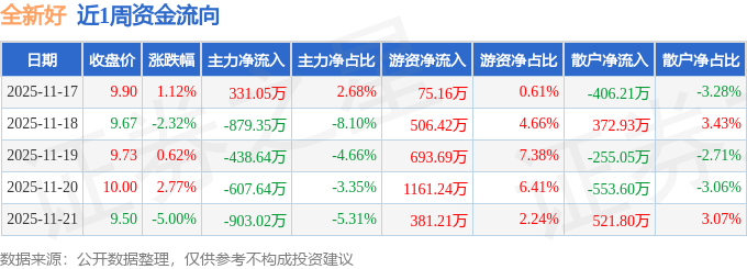 资金流向数据方面,本周全新好主力资金合计净流出2497.6万元,游资资金合计净流入2817.72万元,散户资金合计净流出320.13万元。本周资金流向一览见下表: