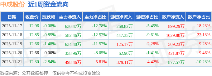 资金流向数据方面,本周中成股份主力资金合计净流出1707.83万元,游资资金合计净流出274.79万元,散户资金合计净流入1982.62万元。本周资金流向一览见下表: