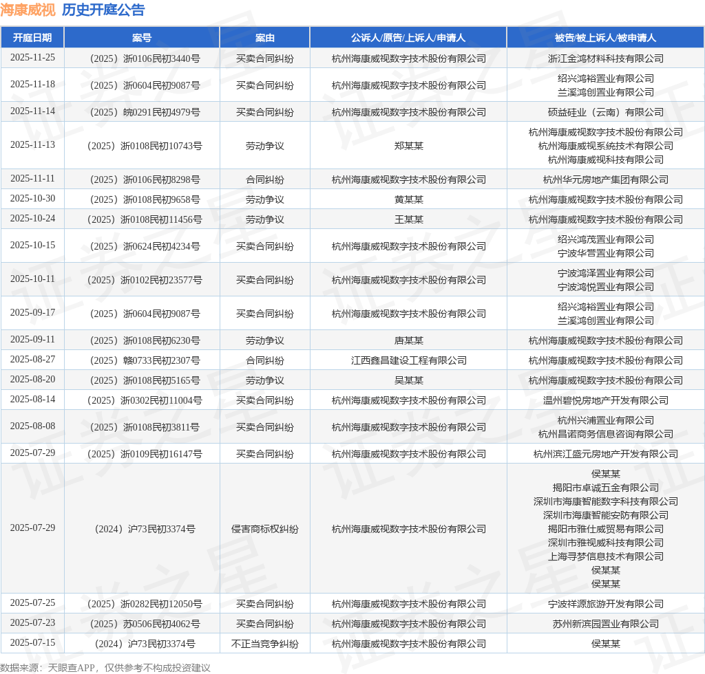 案号:(2025)浙0106民初3440号根据统计,近一年内以杭州海康威视数字技术股份有限公司为当事人的历史开庭公告有60则,其中案由为“买卖合同纠纷”的公告以45则居首,其次为“劳动争议”有5则,“合同纠纷”有4则。历史开庭公告(前20条)如下: