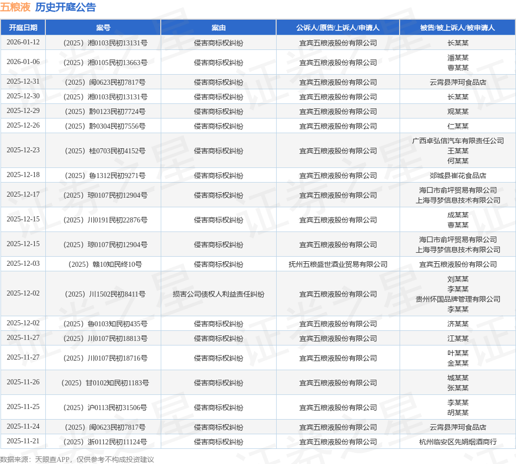 案号:(2025)沪0113民初31506号根据统计,近一年内以宜宾五粮液股份有限公司为当事人的历史开庭公告有335则,其中案由为“侵害商标权纠纷”的公告以297则居首,其次为“商标权权属、侵权纠纷”有16则,“侵害商标权”有6则。历史开庭公告(前20条)如下: