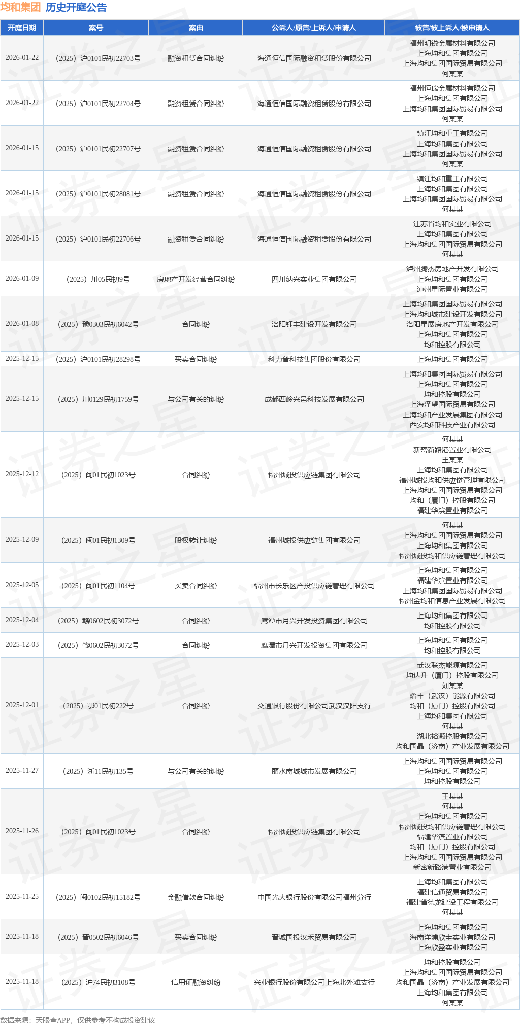 案号:(2025)闽0102民初15182号根据统计,近一年内以上海均和集团有限公司为当事人的历史开庭公告有94则,其中案由为“买卖合同纠纷”的公告以54则居首,其次为“合同纠纷”有11则,“融资租赁合同纠纷”有9则。历史开庭公告(前20条)如下: