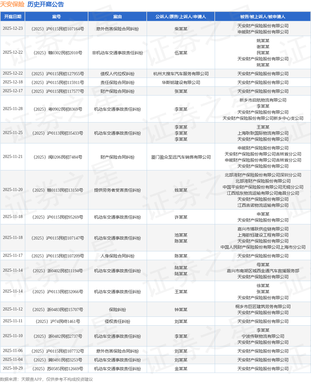 案号:(2025)沪0113民初35433号根据统计,近一年内以天安财产保险股份有限公司为当事人的历史开庭公告有452则,其中案由为“机动车交通事故责任纠纷”的公告以232则居首,其次为“财产保险合同纠纷”有51则,“人身保险合同纠纷”有27则。历史开庭公告(前20条)如下: