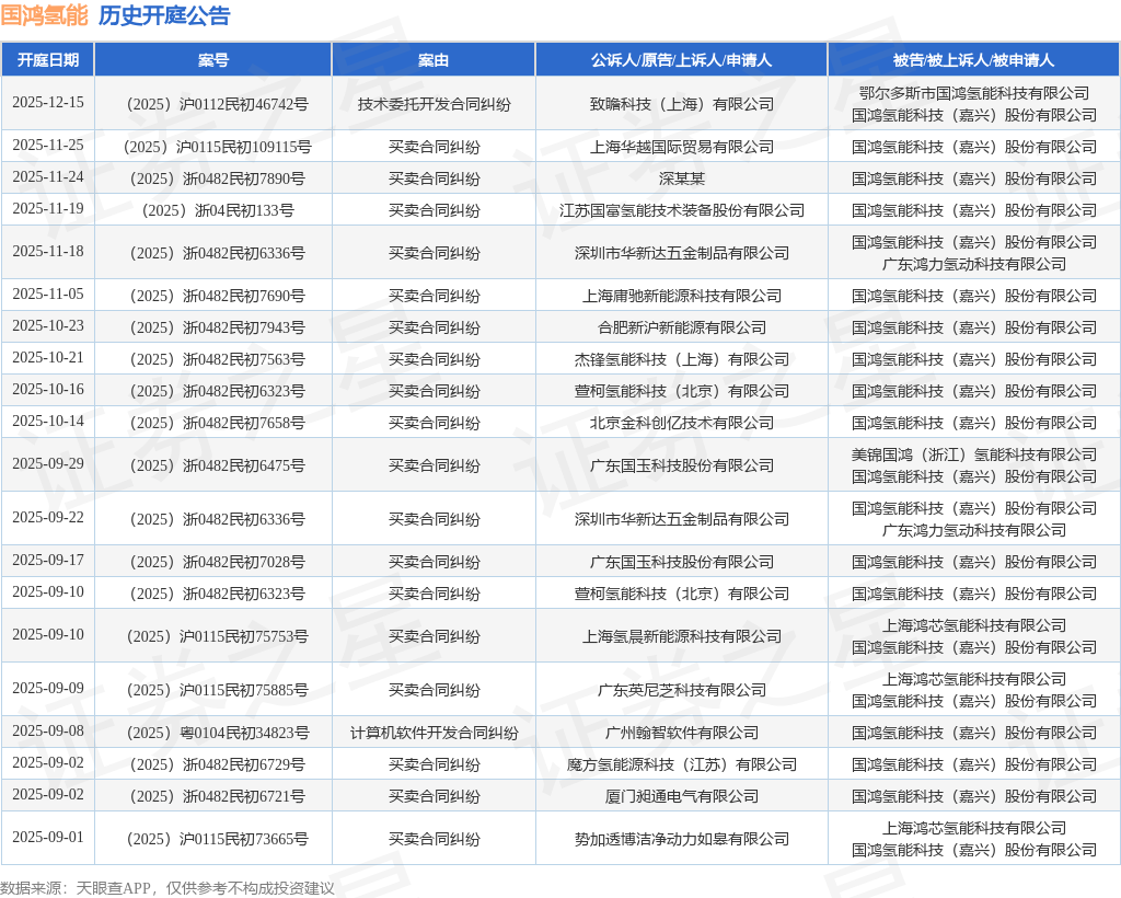 案号:(2025)沪0115民初109115号根据统计,近一年内以国鸿氢能科技(嘉兴)股份有限公司为当事人的历史开庭公告有32则,其中案由为“买卖合同纠纷”的公告以28则居首,其次为“劳动争议”有2则,“技术委托开发合同纠纷”有1则。历史开庭公告(前20条)如下:
